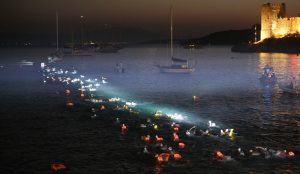 Muğla’nın Bodrum ilçesinde devam eden 16. Uluslararası Arena Aquamasters Yüzme Şampiyonası kapsamında Işık Yolculuğu (Gece Yüzmesi) etkinliği gerçekleştirildi.