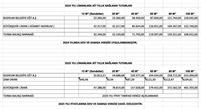 Zam oranları, teknelerin metrekaresine göre değişiklik göstermekte olup fiyat belirlemelerinde Bodrum’daki mevcut balıkçı barınakları ve Muğla Büyükşehir Belediyesi fiyatlandırmaları göz önüne alınmıştır. Yapılan araştırma ve karşılaştırmalarda özel marinalar ise kapsam dışı bırakılmıştır.