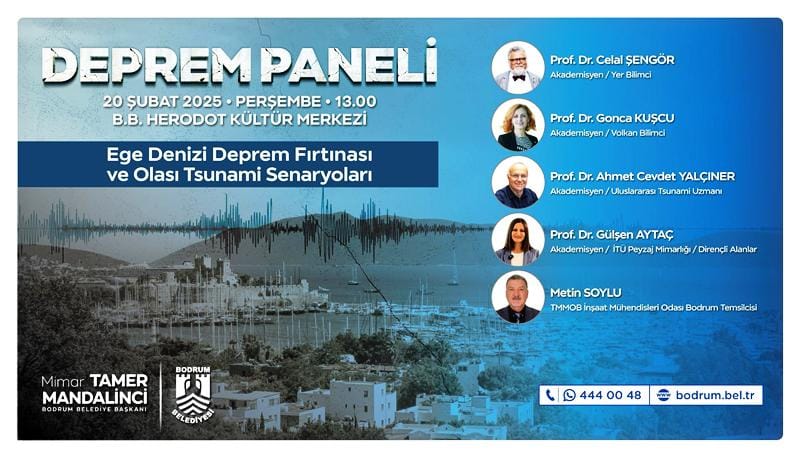 ARENA HABER – 20 Şubat Perşembe günü saat 13.00’te Herodot Kültür Merkezinde “Ege Denizi Deprem Fırtınası ve Olası Tsunami Senaryoları” konulu Deprem Paneli düzenlenecek. Panelde Yer Bilimci Prof. Dr. Celal Şengör, Volkan Bilimci Prof. Dr. Gonca Kuşcu, Uluslararası Tsunami Uzmanı Prof. Dr. Ahmet Cevdet Yalçıner, Peyzaj Mimarı ve Şehir Plancısı Prof. Dr. Gülşen Aytaç ve TMMOB İnşaat Mühendisleri Odası Bodrum Temsilcisi Metin Soylu Ege denizindeki deprem fırtınası ve olası tsunami senaryoları ile ilgili değerlendirmelerde bulunacak.