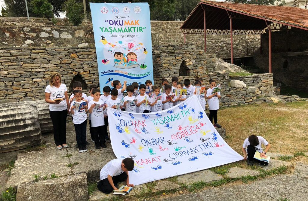 Fransa ve bazı Avrupa ülkelerinin ortaklığıyla Türkiye’deki 81 ilde E-Twinning kapsamında uygulanan “Okumak Yaşamaktır” projesine “Okumak Aydınlığa Kanat Çırpmaktır” sloganı ile katılan Neşe Doğan İlkokulu öğrencileri hem Bodrum’da bulunan tarihi yerleri geziyorlar hem de bu özel mekânlarda kitap okuyorlar.