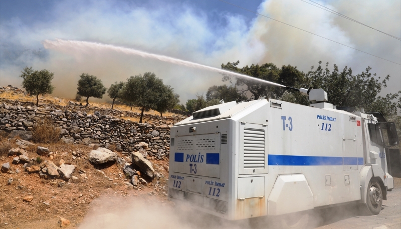 Rüzgarla birlikte hızla yükselen alevleri arazöz ve itfaiyelerin yanı sıra Emniyet Genel Müdürlüğüne ait Toplumsal Olaylara Müdahale Aracı (TOMA) da su sıkarak kontrol altına almaya çalışıyor.
