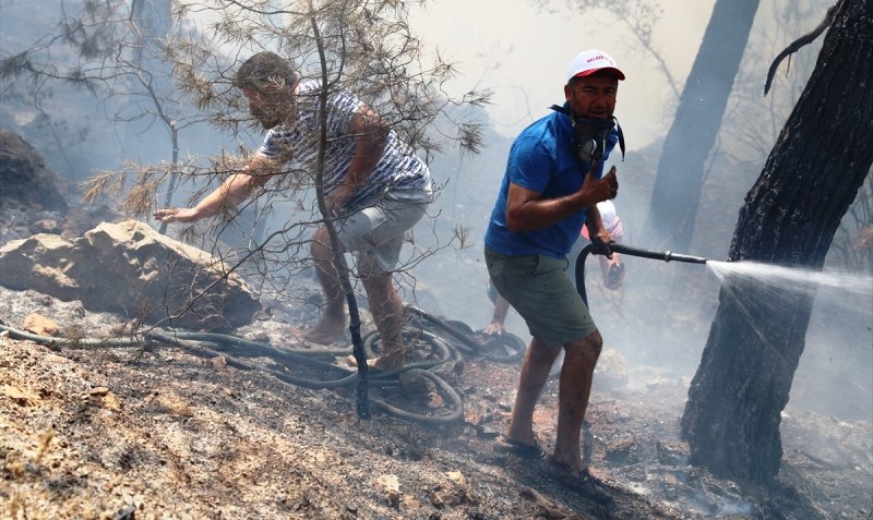Kissebükü mevkisinde ekiplerin söndürme çalışmalarına bazı vatandaşlar da destek veriyor.