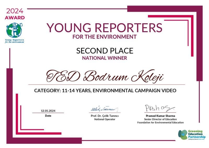 Türkiye Çevre Eğitim Vakfı’nın (TÜÇEV) yürüttüğü “Young Reporters of the Environment (YRE- Çevrenin Genç Sözcüleri)” programına katılarak yeni bir başarıya imza attı.