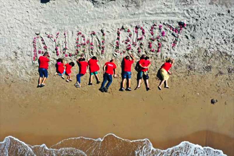 Sahile begonvil çiçekleriyle “Aylan Baby” yazıldı. Aralarında çocukların da bulunduğu grup, aynı Alan bebeğin cansız bedeninin sahile vurduğu gibi kıyıya uzanarak, mültecilerin yaşadığı drama dikkat çekmeye çalıştı.
