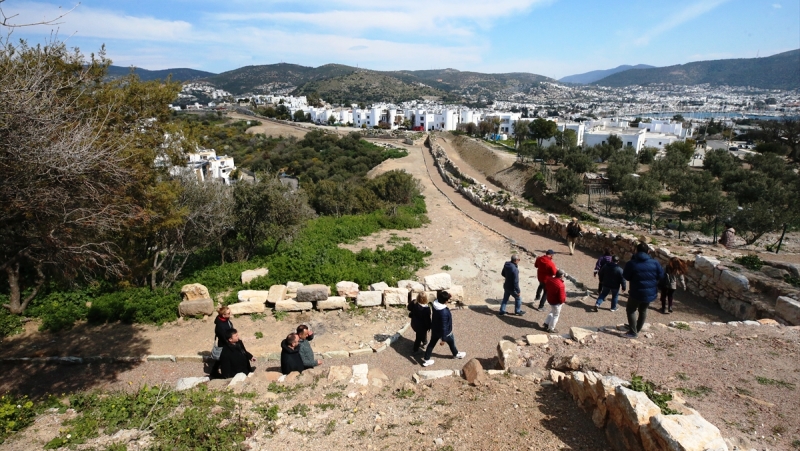 Muğla’nın Bodrum ilçesinde kazı çalışmalarıyla gün yüzüne çıkartılan tarihi sur duvarlarında Bodrum Belediye Başkanı Ahmet Aras ve tur rehberleri, gezi ve inceleme yaptı.