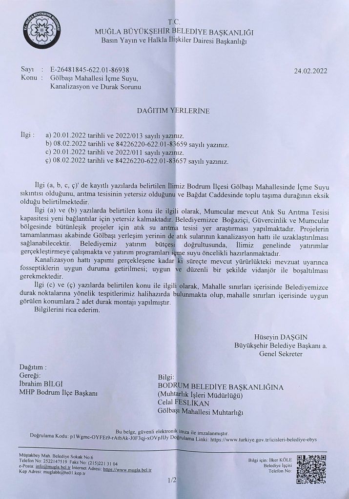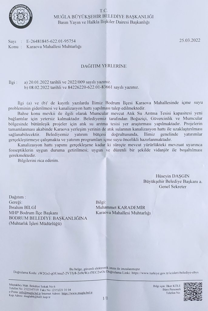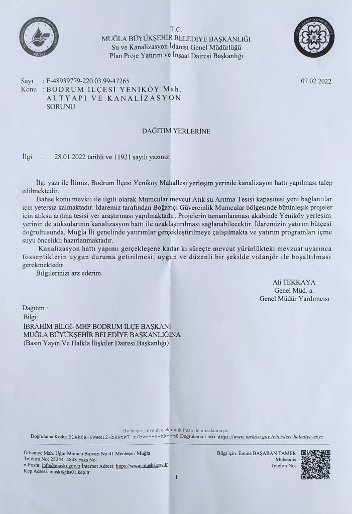 Göreve geldiğimiz günden bu yana Bodrum’un sorunlarıyla ilgili resmi kurumlara 250’ye yakın dilekçe yazdık. Bu dilekçelerin çoğu Muğla Büyükşehir Belediyesi’ne idi. Yine Mumcular, Karaova ve Gölbaşı’nın alt yapı ve kanalizasyon eksikliğiyle ilgili Muğla Büyükşehir Belediyesi’nin tarafımıza yazdığı 07.02.2022, 24.02.2022 ve 25.03.2022 tarihli yanıtlarda kısaca bölgenin mevcut alt yapısının ve Mumcular Arıtma Tesisi’nin yetersiz kaldığı belirtilmiştir. İlgili yazıları da ekte tarafınıza sunuyoruz.