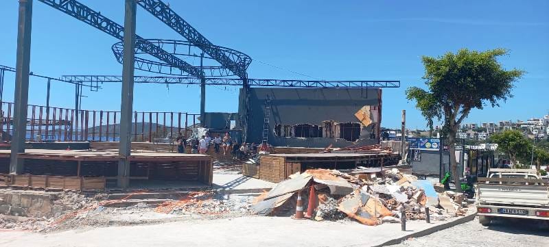 Gümbet Eskiçeşme Mahallesi 916 Ada 9 Parseldeki işletmenin ruhsat eki ve onaylı mimari projesine aykırı olarak yapılan imalatların yıkım işlemleri, belediye ekiplerinin denetiminde sürerken eğlence mekânı olarak kullanılan alanın yıkımının yapılması gereken yerler, işletme sahipleri tarafından yıkılıyor.