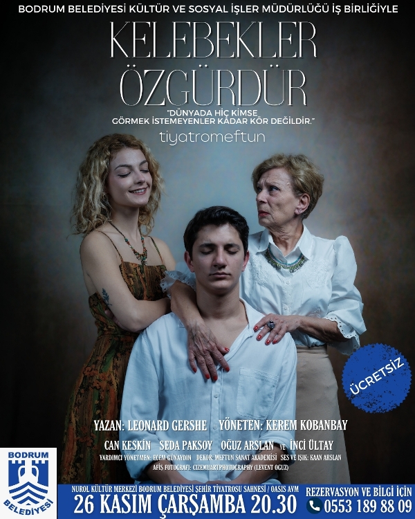 Bodrum Belediyesi’nin kültür-sanat etkinlikleri kapsamında düzenlenen bu özel buluşma, kentin tiyatro yaşamına yeni bir soluk kazandırmayı hedefliyor. Kelebekler Özgürdür, insana ve umuda dair sade ama derin anlatımıyla tiyatroseverleri unutulmaz bir yolculuğa davet ediyor.