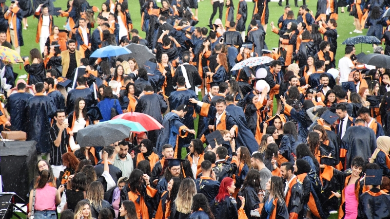Çiçek, “Arkadaşlar, öğrencilerim bu belki de bir ilk olacak. Yağmur altında kep atma töreni yapıyoruz. Hep birlikte keplerinizi gökyüzüne fırlatın.” dedi.