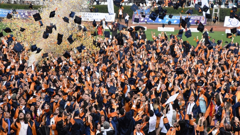 Yağmur nedeniyle konuşma yapmayan Çiçek’in 10’dan geriye saymasıyla keplerini fırlatan öğrenciler, sevinçlerini arkadaşlarına sarılarak paylaştı.