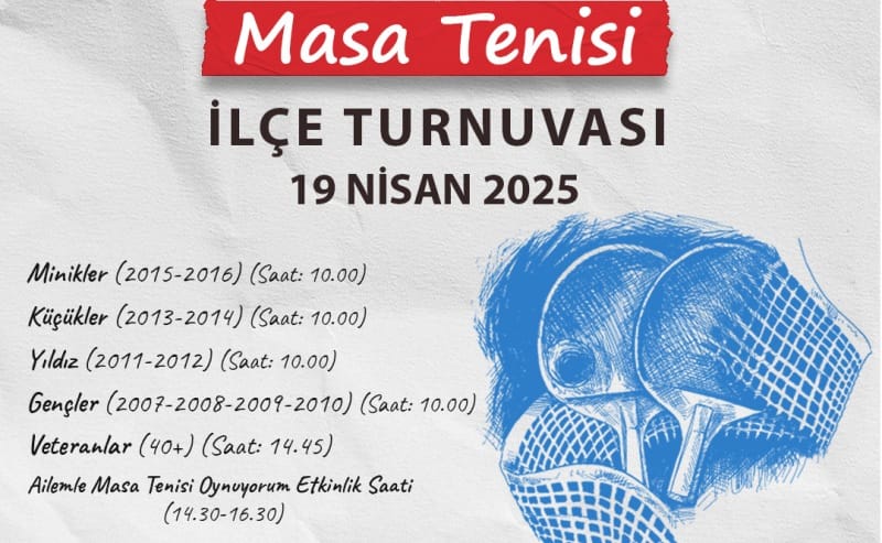Dünya Masa Tenisi Günü etkinlikleri kapsamında düzenlenecek olan “İlçe Masa Tenisi Turnuvası” 19 Nisan 2025 Cumartesi günü gerçekleşecektir. Minikler, Küçükler, Yıldızlar, Gençler, Veteran +40 Yaş üzere 6 farklı kategoride gerçekleşecek müsabakalar aynı gün kupa ve madalya töreni ile son bulacak.