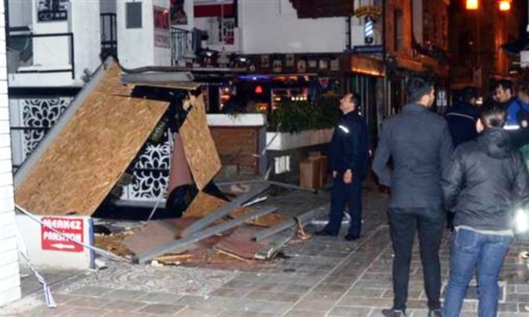 Ahşap ve demir malzemenin bir kısmı karşıdaki işletmenin pergolasına çarparak dururken, diğer parçası ise arka sokaktaki bir otomobilin üzerine düştü. Olayda şans eseri yaralanan olmadı.