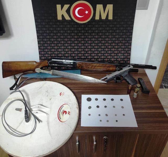 Arena Bodrum Haber – Operasyonda Roma dönemine ait olduğu değerlendirilen 18 sikke, “lejyoner kılıcı” olarak adlandırılan parça, kazıda kullanılan alan tarama cihazı, av tüfeği, kurusıkı tabanca ele geçirildi.