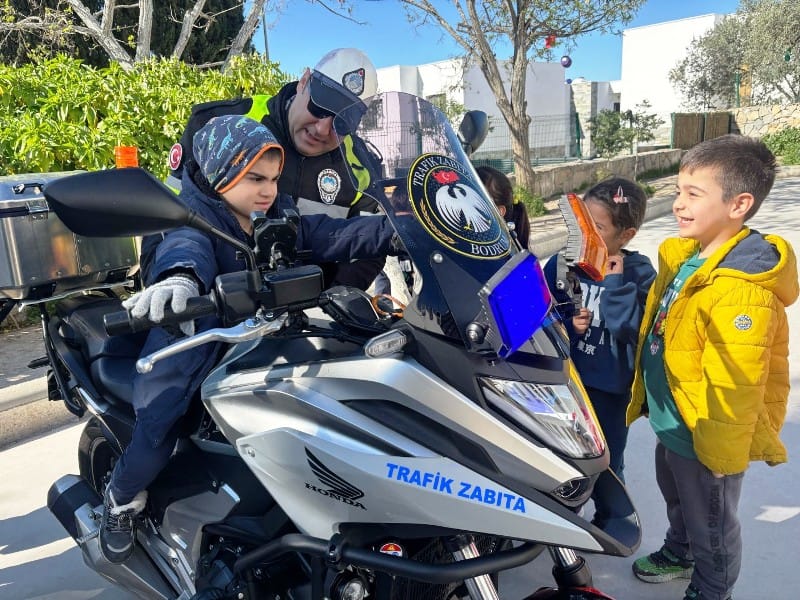 Trafik zabıtaları tarafından öğrencilere trafik ışıkları, yaya geçitleri ve güvenli yolculuk konuları hakkında bilgiler verilirken görev araçları da tanıtıldı. Özellikle motosiklet ile yakından ilgilenen çocuklar anons ve siren sistemlerini deneyimleyerek öğrenmenin keyfini yaşadı.