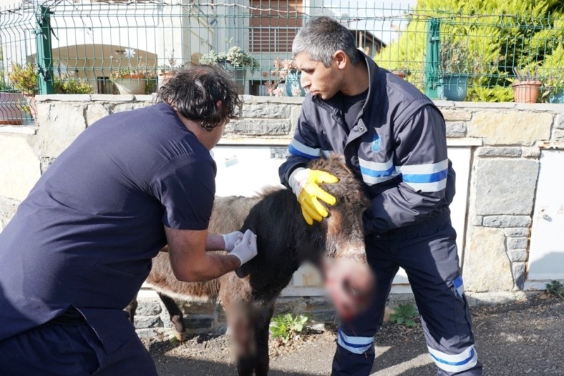 Bodrum’da Veteriner İşleri Müdürlüğü’ne bağlı petbulance ekibi, yaralı bir eşeğe ilk müdahaleyi yaparak kanama kesici ve vitamin iğneleri yaptı.